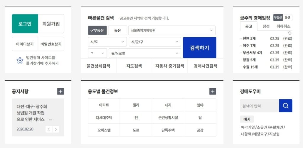 가장 먼저 알아야 할 곳은 대법원이 직접 운영하는 경매 정보 공개 시스템입니다. 이 사이트는 전국 법원에서 진행되는 부동산·동산 경매 물건을 공식적으로 공고하는 역할을 합니다. 즉, 원천 데이터의 출발점이라고 볼 수 있습니다.
